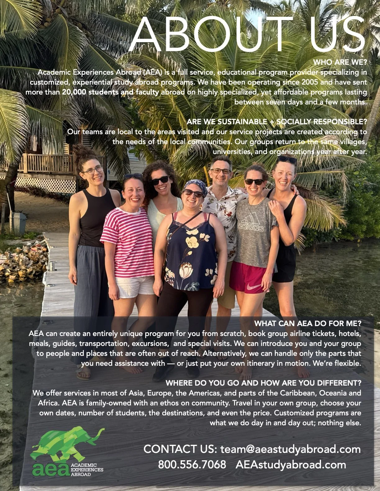 Below are a few program overviews and more information about AEA. By clicking the gallery images, you will see each page one at a time. Please contact us if you would like a downloadable PDF or a print version, to share with faculty. We are also happy to share more detailed proposals that we have run to locations that are of particular interest.